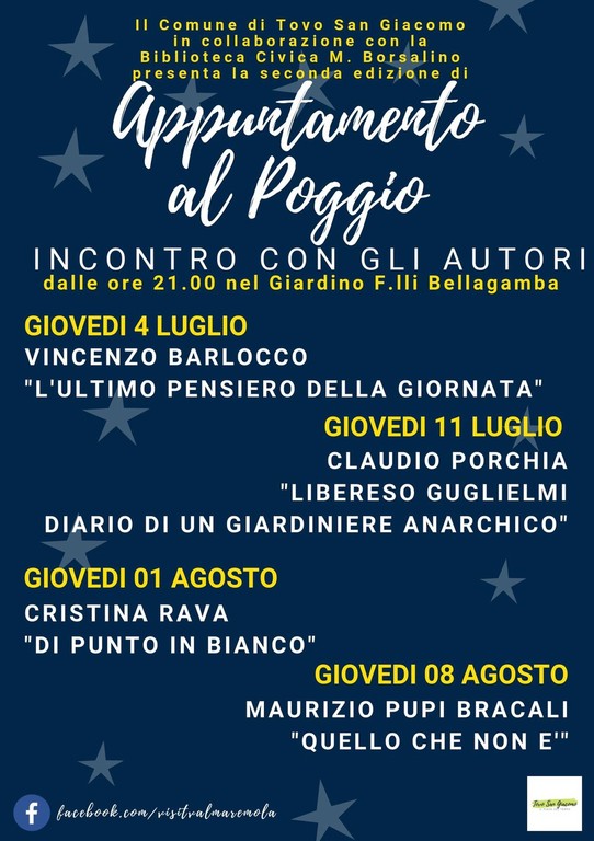 Prosegue con successo la seconda edizione di "Appuntamento al Poggio", la rassegna letteraria ospitata nella cornice raccolta e magica del Giardino "Fratelli Bellagamba" al Poggio di Tovo San Giacomo.