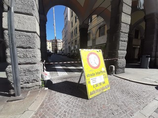 Questa mattina è stata chiusa al traffico veicolare via Aü Fossu a Savona. La polizia locale ha posizionato il cartello di divieto per consentire alla gru di Vernazza di intervenire sul tetto del palazzo della Banca Popolare di Novara.