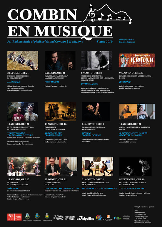 La seconda edizione è cresciuta, questa è la prima grande novità, e si è allargata ai comuni di Valpelline e di Doues, con dodici appuntamenti, quattro per ogni comune alla scoperta di alcuni fra i posti più significativi e suggestivi della zona. "Il territorio ha un ruolo determinante nella direzione artistica del festival - racconta il direttore artistico Federico Bagnasco -. La parola Combin nel nome, oltre all’ovvia connotazione geografica, vuole proprio rimandare a una combinazione tra la musica e un ambiente, un nuovo contesto sonoro che possa aggiungere una nuova prospettiva, quasi una nuova dimensione, o anche semplicemente fare da pretesto per la riscoperta di un luogo, di una particolare e inconsueta scenografia dove l’arte musicale si sviluppa".