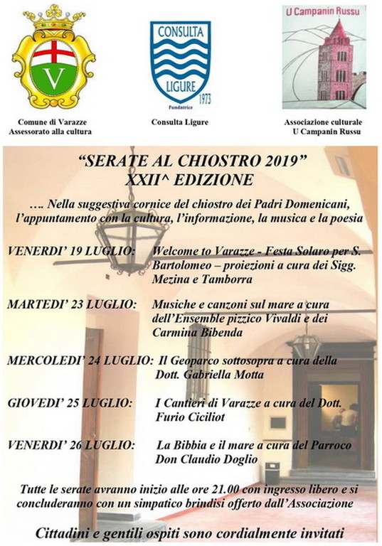 L’Associazione Culturale “U Campanin Russu”, con il patrocinio dell’Assessorato alla Cultura della città di Varazze e la collaborazione della Consulta Ligure, di Enti ed associazioni, ha organizzato anche quest’anno le “Serate al Chiostro”, la sempre interessante manifestazione giunta alla XXIII edizione.