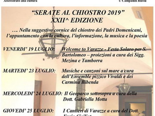 L’Associazione Culturale “U Campanin Russu”, con il patrocinio dell’Assessorato alla Cultura della città di Varazze e la collaborazione della Consulta Ligure, di Enti ed associazioni, ha organizzato anche quest’anno le “Serate al Chiostro”, la sempre interessante manifestazione giunta alla XXIII edizione.