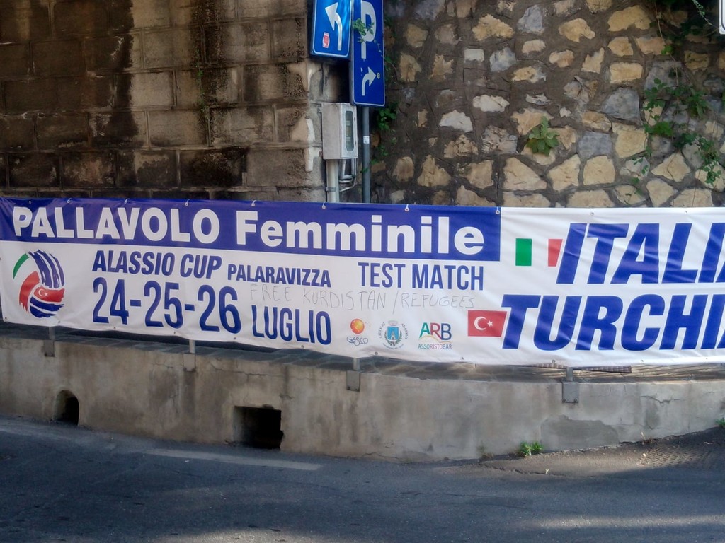 “Free Kurdistan refugees”, libertà per i profughi curdi. Queste le due scritte, vergate a pennarello, che nella notte sono apparse sugli striscioni pubblicitari a bordo strada ad Alassio che annunciano i tre test-match Italia-Turchia di volley femminile.