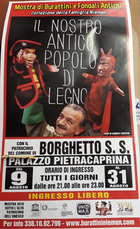 Dal 9 al 31 agosto, all'interno di Palazzo Pietracaprina a Borghetto Santo Spirito, andrà in scena la mostra di Burattini e Fondali antichi della collezione della famiglia Niemen.