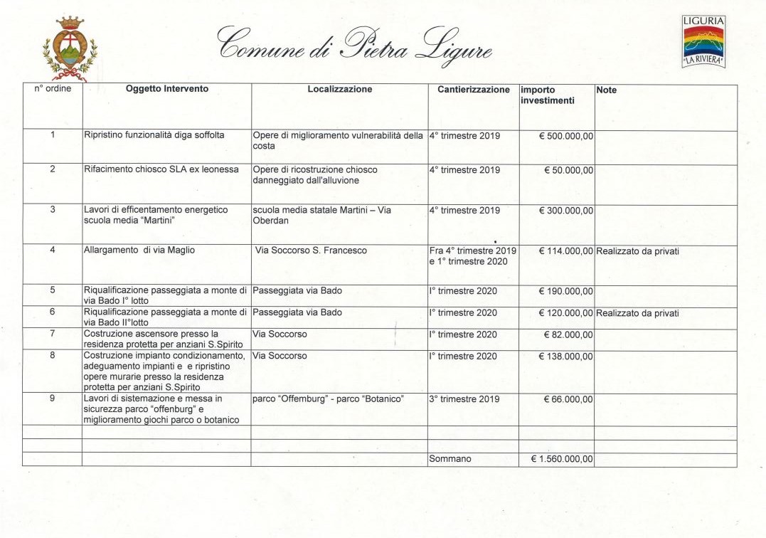 "Con un importante impegno finanziario che supera il milione e mezzo di euro, è stato approvato il piano degli interventi pubblici che nei prossimi mesi interesseranno il Comune di Pietra Ligure". Così Luigi De Vincenzi e Francesco Amandola, rispettivamente sindaco e assessore ai lavori pubblici del Comune di Pietra Ligure, hanno introdotto la conferenza stampa relativa all'approvazione dei lavori pubblici che nei prossimi mesi interesseranno la località rivierasca.