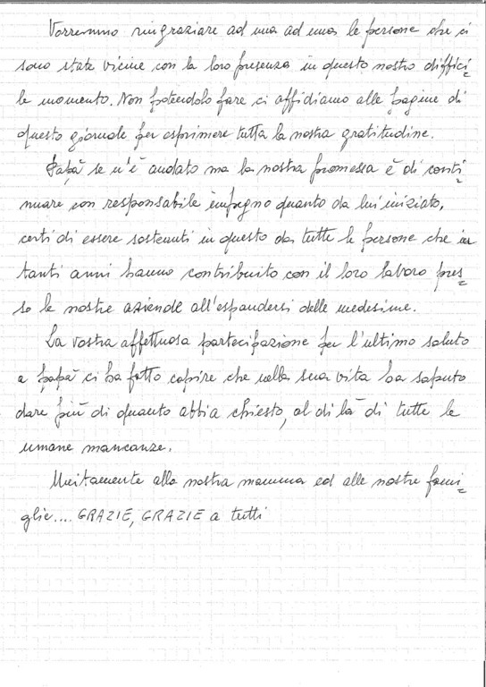 Papà se ne è andato ma la nostra promessa è di continuare con responsabile impegno quanto da lui iniziato, certi di essere sostenuti in questo da tutte le persone che in tanti anni hanno contribuito con il loro lavoro presso le nostre aziende all’espandersi delle medesime.