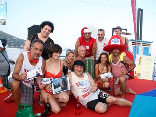 Molo gremito di bagnanti per assistere all'edizione 2019 del Cantadoccia. Circa 50 gli iscritti a cantare sotto la doccia, il motivo era prescelto a piacimento da ciascuno.