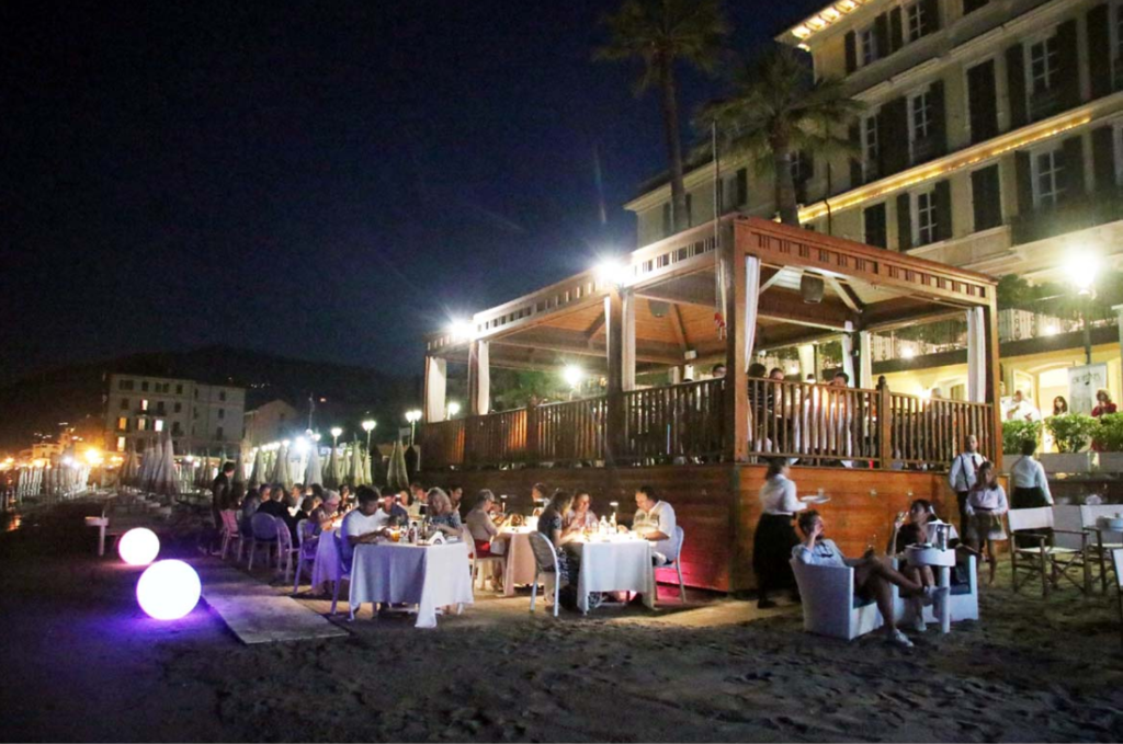 Una suggestiva cena sulla spiaggia di Alassio, incantevole per il chiar di luna e il mare calmo. incorniciata dalla artististica performance di Rudy Mascheretti, in arte Rudy Mas, che ha trasferito le immagini fotografiche di Emerson Fortunato ritraenti "Il sogno di Adelasia".