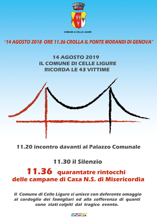 Domani 14 agosto l’Amministrazione Comunale di Celle Ligure si riunirà alle 11.20 davanti al Palazzo Comunale per ricordare le vittime del crollo del Ponte Morandi.