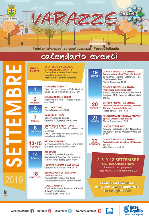 Varazze svela il calendario per il mese di settembre: dalla manifestazione dedicata alle Associazioni Sportive "All Sport", all'ultimo appuntamento con la rassegna Varazze è Lirica, al Lanzarottus Day e al concorso nazionale per scoprire giovani autori di canzoni "Genova per Voi" che, dal 18 al 22 settembre, porterà a Varazze ospiti quali: Franco Fasano, autore di successi come Mi manchi (Fausto Leali), Ti lascerò (Fausto Leali/Anna Oxa), Regalami un sorriso (Drupi) ma anche di canzoni per lo Zecchino d’Oro (Goccia dopo goccia, Katalicammello…) e sigle di cartoni animati (Piccoli problemi di cuore, Pesca la tua carta Sakura, Rossana…); Willie Peyote, rapper vincitore del talent Genova Per Voi che, con il suo album La sindrome di Tôret ha conquistato la Top 10 dei dischi più venduti in Italia; Federica Abbate che vince il talent nel 2013 e ottiene in premio un contratto come autrice per Universal Music Publishing, scrive per Eros Ramazzotti, Loredana Berté, Giusy Ferreri, Alessandra Amoroso, Boomdabash, Marracash, Benji e Fede, Francesca Michielin e tanti altri; Emanuele Dabbono, cantautore noto al grande pubblico per la partecipazione nel 2008 alla prima edizione di X Factor e, più recentemente, come autore degli ultimi successi di Tiziano Ferro; e Luca Galtieri, inviato di Striscia la Notizia.