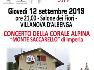 Giovedì 12 settembre, alle ore 21.00 presso il Salone dei Fiori di Villanova d'Albenga, si svolgerà il concerto della Corale Alpina "Monte Saccarello" di Imperia.