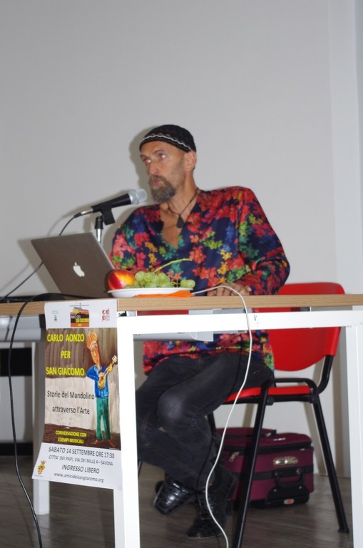 Carlo Aonzo ha ripercorso la storia del mandolino nei millenni, nelle sue varie forme e trasformazioni, proiettando immagini di mandolini inseriti in opere d’arte sia pittorica che scultorea. Tra queste anche la lunetta del duomo di Savona (navata sinistra) proveniente dalla antica cattedrale del Priamar ed un frontale di altare di provenienza savonese, probabilmente da San Domenico, attualmente al Metropolitan Museum di New York.