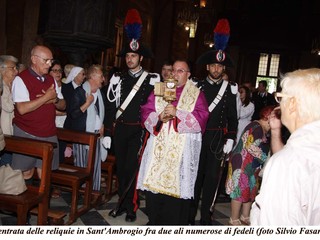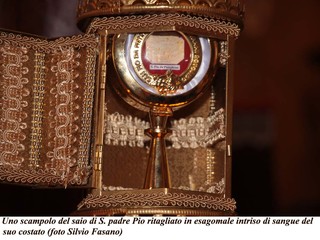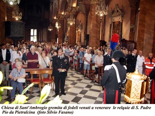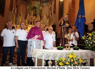 Doveva arrivare sul molo via mare, ma il maltempo non lo ha consentito e quindi la teca contenente le reliquie di Padre Pio (un lembo di stoffa ritagliato esagonalmente, macchiato del sangue del Santo di Pietralcina) è giunta via terra e portata in processione dal pontile Bestoso sino alla chiesa di Sant'Ambrogio, attorniata da uno stuolo di fedeli venuti a venerarla. Tantissime le autorità civili, militari e religiose della provincia presenti all'importante momento.