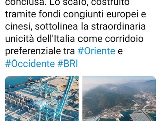 Emblematico il tweet pubblicato dall'ambasciata della Repubblica cinese in Italia: "La costruzione del nuovo #hub portuale di #VadoLigure è quasi conclusa. Lo scalo, costruito tramite fondi congiunti europei e cinesi, sottolinea la straordinaria unicità dell'Italia come corridoio preferenziale tra #Oriente e #Occidente". Con l'hashtag #Bri finale che sta a significare (Belt & road initiative), cioè la nuova Via della seta su cui punta il Governo di Pechino.