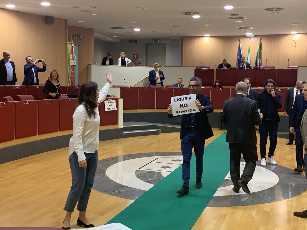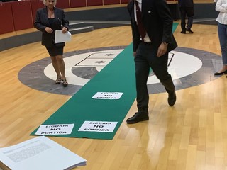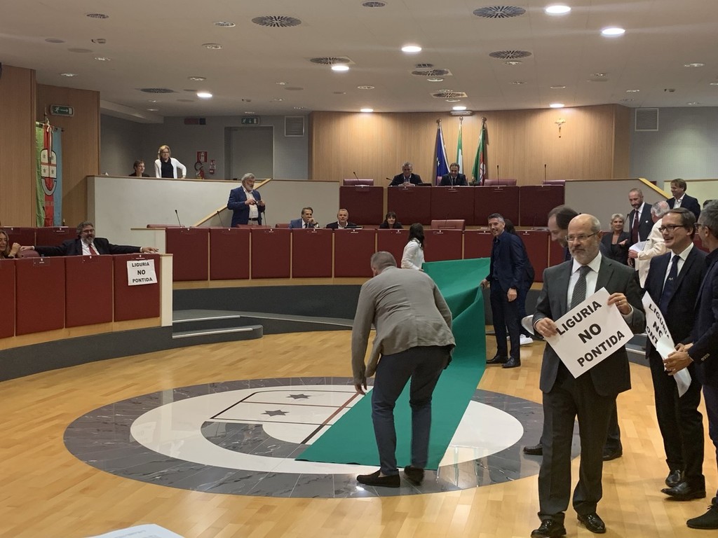 "Abbiamo srotolato un tappeto verde in Aula per protestare contro l'ennesimo testo illegittimo della Giunta Toti, che senza alcun rispetto per i moniti di illustri costituzionalisti, ha deciso di impegnare tempo e denaro di questa Assemblea legislativa per far passare una legge elettorale sbagliata nel merito e nella stesura del testo, che la Corte Costituzionale sicuramente casserà. La maggioranza, seguendo gli ordini di Salvini, ha calpestato il parere negativo della I Commissione. I sudditi del 'capitano' non hanno gradito: non amano che si ricordi ai cittadini la loro sudditanza al partito che da Pontida detta anche l'agenda ligure. Abbiamo toccato un nervo scoperto". Così il gruppo dei Cinque Stelle in Consiglio Regionale ha improvvisato un flash mob di protesta (a cui si è unito anche il Pd).