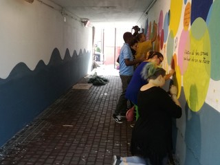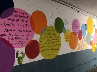 I ragazzi, coordinati da Emanuela Borra e dalla consigliera comunale Camilla Vio, hanno sviluppato l’idea; poi, con l’aiuto di volontari di altre associazioni, dei giovanissimi partecipanti al progetto “puliamo il mondo”, e di amici che si sono aggiunti per puro spirito di collaborazione, in due giorni ha preso forma un murale che rappresenta i valori della gentilezza e della crescita personale attraverso disegni, elementi geometrici e citazioni in diverse lingue.