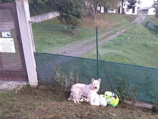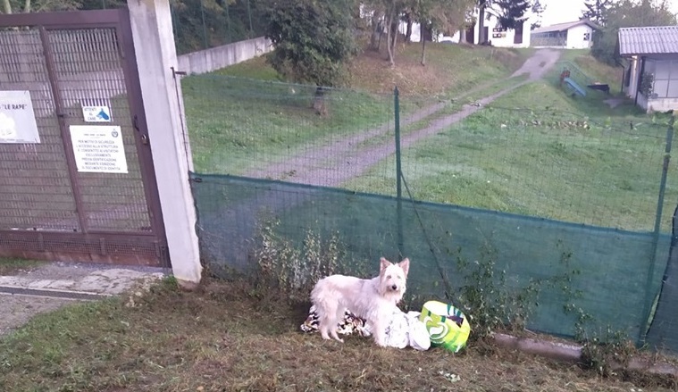 Un cagnolino legato alla rete del canile con il suo corredino. La denuncia arriva dalla pagina Facebook del Canile di Cairo Montenotte LNDC.