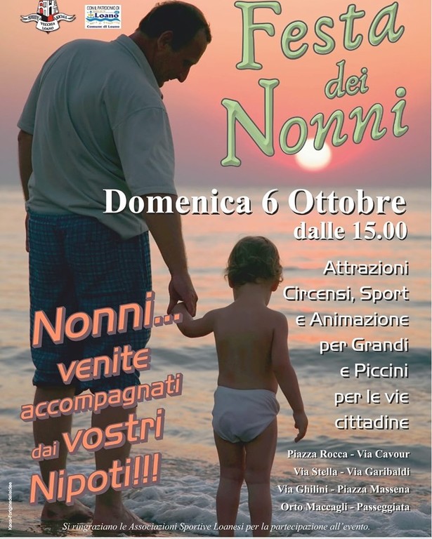 “Nonni, venite accompagnati dai vostri nipoti” è lo slogan che accompagna la “Festa dei nonni”, la manifestazione organizzata dall'associazione Vecchia Loano con il patrocinio dell'assessorato a turismo, cultura e sport del Comune di Loano.
