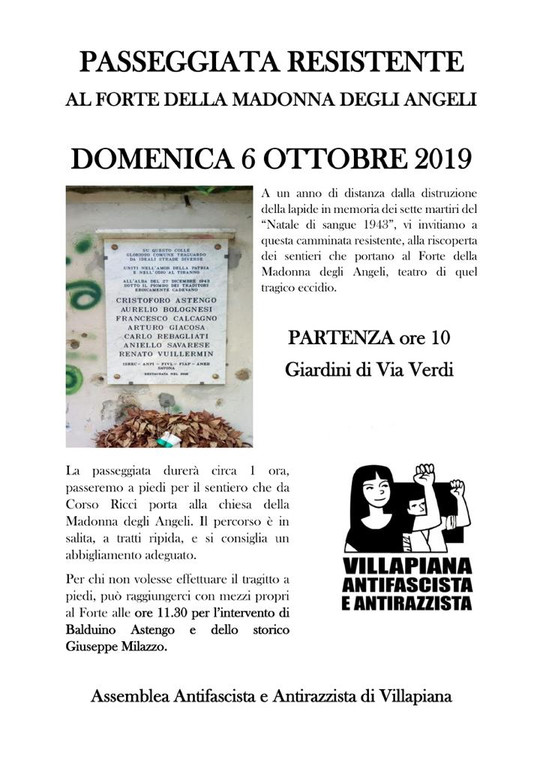 "Il senso di questa passeggiata è ricordare non solo il tragico “Natale di sangue 1943”, ma anche fatti successivi che ci riportano all'attualità dell'antifascismo - proseguono gli esponenti dell'Assemblea Antifascista e Antirazzista - La lapide che ricorda l'eccidio è stata distrutta per due volte, l'ultima poco più di un anno fa. E un anno fa, il 13 ottobre 2018, Balduino Astengo ne fece realizzare una nuova, recante le stesse parole di quella originaria. Alla cerimonia di ricollocazione parteciparono circa 200 persone, compresa la sindaca Ilaria Caprioglio. Proprio in questi giorni, su una pagina Facebook di chiara impostazione fascista, sono stati pubblicati il manifesto mortuario e la foto di due partigiane defunte, accompagnati da post insultanti e da commenti ancora più vergognosi, il tutto all'insegna di una destoricizzazione dei fatti avvenuti nel periodo della Resistenza".