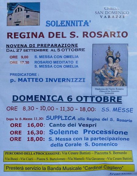 La Solennità della Madonna del Rosario, iniziata a Varazze il 27 settembre nella Chiesa di San Domenico con la novena di preparazione, proseguirà fino a sabato 5 ottobre: ore 9:00 S. Messa con Omelia e ore 17:30 Rosario Meditato e S. Messa con Omelia, predicatore padre Matteo Invernizzi.