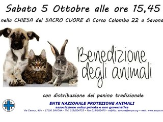 Nell’ambito della 17a edizione della Giornata degli Animali Enpa, si svolgerà sabato 5 ottobre a Savona la 15a Benedizione degli Animali, organizzata dai volontari della Protezione Animali savonese.