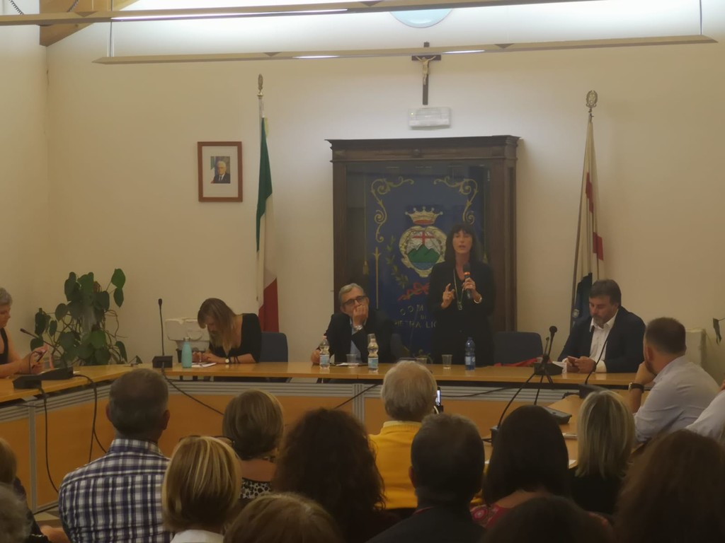 Sala consiliare "Augusto Rembado" di Pietra Ligure gremita per l'incontro con i parlamentari di Italia Viva, la nuova forza politica nata dopo l'addio di Matteo Renzi al Partito Democratico.