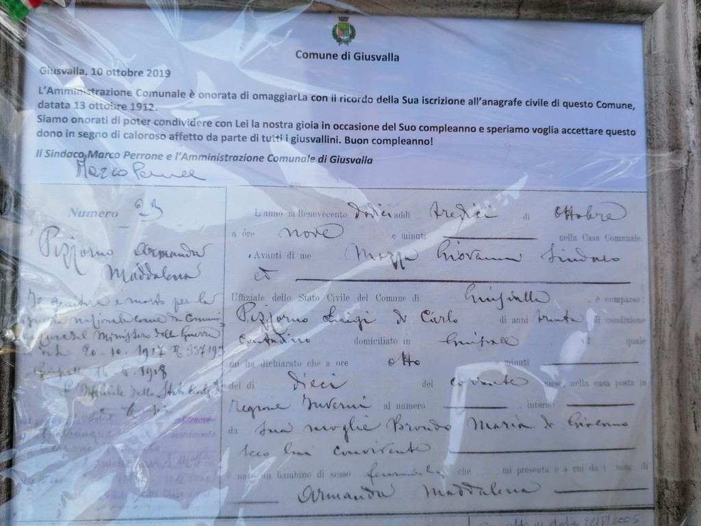 Tra una fetta di torta e qualche foto ricordo, i componenti della giunta comunale hanno donato alla signora Armanda una copia (ovviamente incorniciata) della sua iscrizione all'anagrafe civile del Comune di Giusvalla e un bel mazzo di fiori.