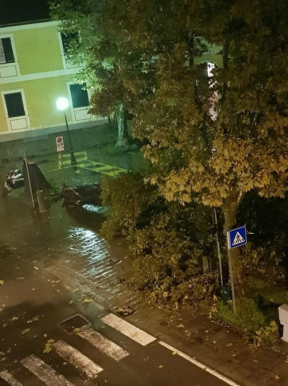 Secondo quanto riferito, la caduta della pianta avrebbe danneggiato in maniera importante due scooter parcheggiati poco distante.
