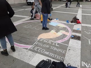 Ieri mattina in piazza Sisto a Savona gli alunni del Liceo Artistico Chiabrera-Martini hanno realizzato sulla pavimentazione di fronte al comune immagini ispirate alla sicurezza.