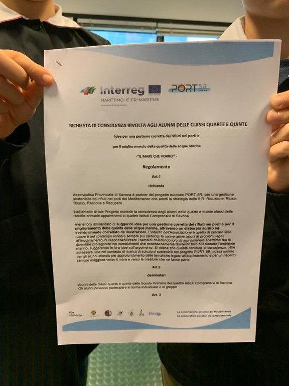 In un mondo in cui la maggior parte delle persone si lamenta senza voler fare nulla per migliorare la situazione, i bambini capiscono che i rifiuti non devono essere lasciati in mare, che bisogna trovare delle soluzioni. Assonautica crede molto nelle loro capacità e per questo ha pensato, nell'ambito del progetto europeo PORT-5R del quale è partner, di chiedere ufficialmente la loro consulenza. Il progetto PORT-5R ricerca soluzioni per una gestione sostenibile dei rifiuti nei porti del Mediterraneo che adotti la strategia delle 5 R: Riduzione, Riuso, Riciclo, Raccolta e Recupero.
