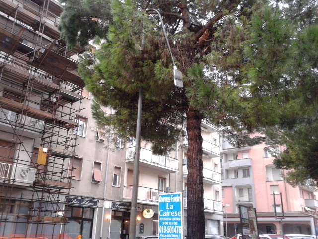 Lampione pericolante nella piazzetta adiacente (via Baccino) all'ospedale "San Giuseppe" di Cairo Montenotte. La segnalazione arriva da un cittadino.