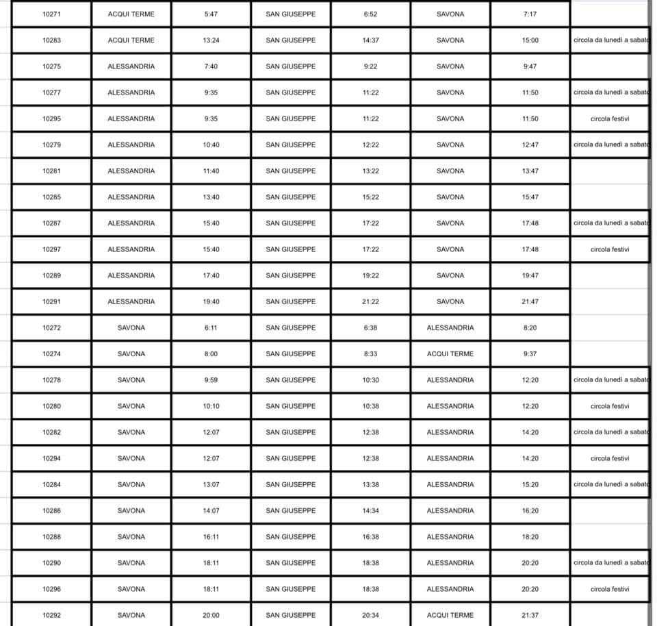 "La prima tabella (che potete trovare insieme alle altre allegata al nostro articolo ndr) riguarda i treni che sono attualmente in circolazione, la seconda è la terza invece, rappresentano quelli che riprenderanno a circolare presumibilmente da martedì. Preciso anche che il treno in arrivo a Savona alle 7.53 da domani avrà una capienza di 900 posti" ha spiegato Berrino.