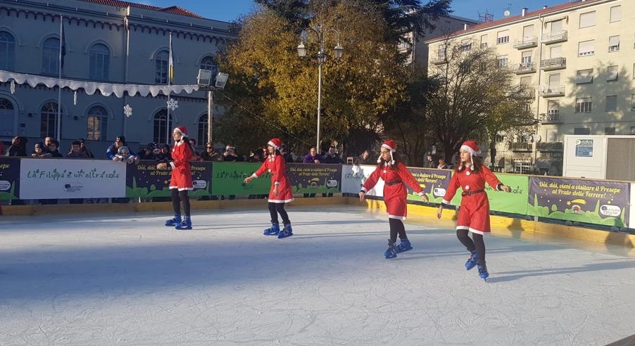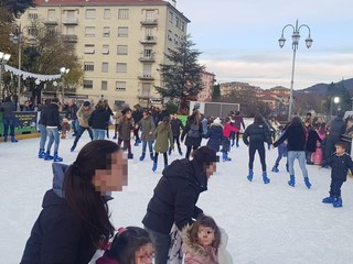 Inaugurata la pista da pattinaggio su ghiaccio in piazza della Vittoria a Cairo Montenotte. Il taglio del nastro si è tenuto oggi pomeriggio.