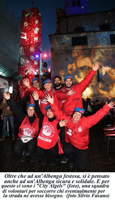 Alle prime effemeridi, nel tardo pomeriggio, tutti al Centro Storico per respirare l'aria natalizia che questo nuovo allestimento offre al pubblico. Ma oltre che festosa, Albenga si vuole presentarsi anche sicura, con il servizio di volontariato offerto da una squadra denominata "City Angels", gli Angeli della Città che provvedono a soccorrere chi eventualmente ne ha bisogno (anziani che perdono la strada, se qualcuno ha freddo, qualsiasi cosa che possa essere al di fuori del soccorso medico a cui pensano Croci Rossa e Bianca).