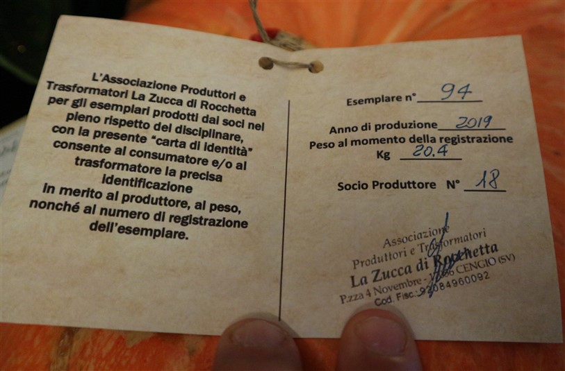 La Zucca di Rocchetta, inserita nell’elenco nazionale dei prodotti agroalimentari tradizionali è dal 2014 un prodotto De.Co. del Comune di Cengio. Nel 2005 è stata salvata dall’estinzione da Slow Food, partendo dai pochi semi rintracciati in una frazione di Cengio appunto Rocchetta, dove l’utilizzo più diffuso era relativo a cucinare risotti, ripieni di ravioli, nella minestra e per la preparazione di una crema vellutata. Viene raccolta come da disciplinare alla fine di settembre inizio ottobre e particolarmente utilizzata per preparazioni di grande qualità in cucina fino al mese di agosto, ma grazie alle sue proprietà di lunga conservazione può arrivare in alcuni casi anche a 18 mesi. Ogni anno le migliori zucche dei soci produttori vengono registrate e ad ognuna viene apposto al picciolo un cartellino riportante il numero dell’esemplare, il peso, il numero del socio produttore al fine di garantirne la piena tracciabilità, inoltre con la produzione 2019 ogni esemplare viene accompagnato dalla sua “carta di identità riportante tutte le informazioni della registrazione.