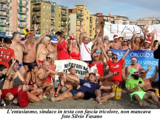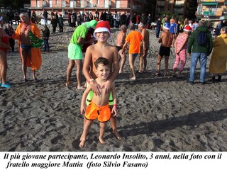 La bella giornata di sole ha riempito di buonumore ed allegria il pubblico e i 150 partecipanti al tradizionale tuffo in mare svoltosi presso i Bagni Milly di Borghetto Santo Spirito. Il più anziano di loro è stato l'87enne Salvatore Lombardo, il più giovane Leonardo Insolito di tre anni che ha trascinato con sé per fargli compagnia il fratello maggiore Mattia. Molti i travestimenti spiritosi.
