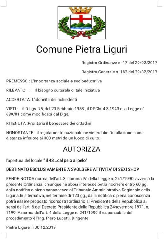 Questa mattina, al momento dell'apertura del negozio per l'ultima volta, i due titolari hanno scoperto una nuova destinazione d'uso per la loro attività: da "Gino e Piero" a "Luis e Pier, al 43 - sexy shop... dal pelo al pelo". Sulla porta d'ingresso, infatti, campeggiava una nuova insegna con un disegno raffigurante proprio i due parrucchieri pietresi intenti a presentare la loro prossima occupazione con tanto di ordinanza comunale ben in mostra.