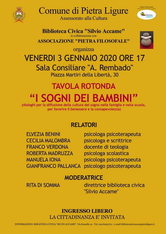 Domani, venerdì 3 gennaio, alle ore 17.00, nella Sala Consiliare del Comune di Pietra Ligure “Augusto Rembado”, tavola rotonda “I sogni dei bambini - Dialoghi per la diffusione della cultura del sogno nella famiglia e nella scuola, per favorire il benessere e la consapevolezza”, organizzata dall’Assessorato alla Cultura del Comune di Pietra Ligure, l'Associazione “Pietra Filosofale” e la Biblioteca Civica "Silvio Accame".