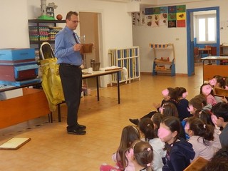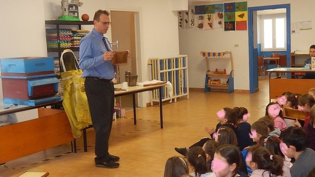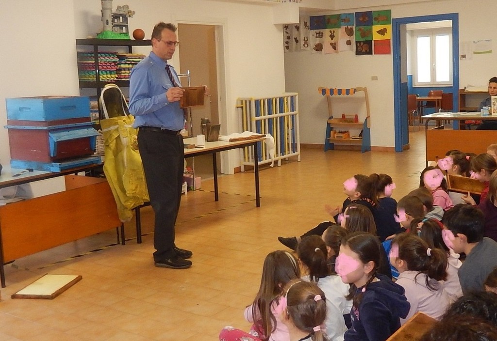 Aiutandosi con la vecchia casetta realizzata da suo nonno un quarantina di anni fa, ma ancora perfettamente funzionante e soprattutto adatta a far comprendere agli interessati alunni come si compone l'arnia in tutte le sue parti, ha spiegato le varie fasi della vita dell'alveare, mostrando e facendo toccare ai giovani alunni i vari componenti con la cera e il miele ancora sopra, l'utilizzo degli attrezzi e le protezioni per la raccolta del miele. Rispondendo inoltre a tutte le loro domande.