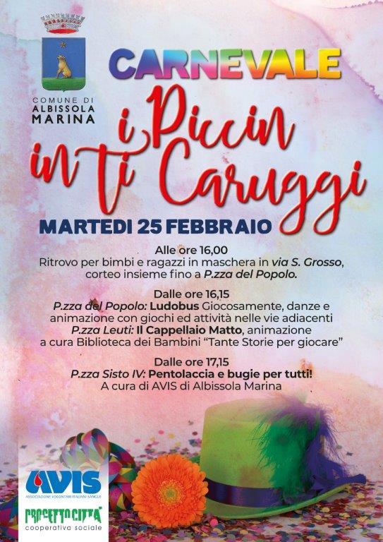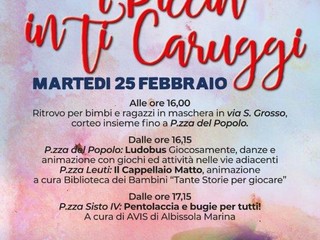 Martedì 25 febbraio a partire dalle ore 15.30 animazione con il Ludobus Giocosamente, Il cappellaio matto a cura della Biblioteca dei Bambini “Tante storie per giocare” e pentolaccia e bugie grazie alla collaborazione dell’AVIS di Albissola Marina.
