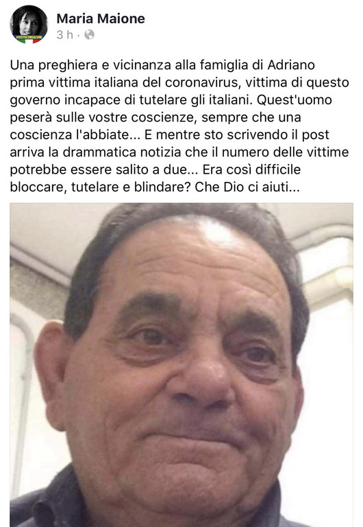 "Una preghiera e vicinanza alla famiglia di Adriano prima vittima italiana del coronavirus, vittima di questo governo incapace di tutelare gli italiani - il post social dell'esponente savonese della Lega - Quest'uomo peserà sulle vostre coscienze, sempre che una coscienza l'abbiate... E mentre sto scrivendo il post arriva la drammatica notizia che il numero delle vittime potrebbe essere salito a due... Era così difficile bloccare, tutelare e blindare? Che Dio ci aiuti...".