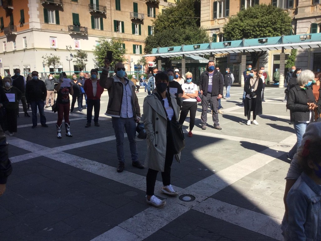 Aiutateci a riaprire, #iononpossoriaprire, #risorgiamo Italia. Queste tra le parole scritte sui fogli, cartelloni, striscioni, tenuti in mano dai titolari degli esercizi commerciali di Savona che si sono ritrovati, provando a rispettare la distanza di sicurezza, in piazza Sisto a Savona.