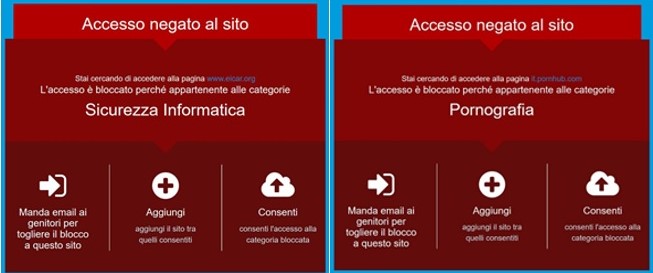 Ogni modifica apportata al pannello di controllo, compreso ogni accesso ad esso sarà notificato al genitore attraverso l’invio di una e-mail. Così anche saranno notificati tramite e-mail anche i siti che vengono bloccati e che il bambino avrà tentato di visitare. Al bambino che cercherà di visitare un sito non permesso comparirà invece un messaggio simile a quelli riportati sotto e che riporterà anche il tipo di sottocategoria proibita in cui il sito rientra.