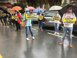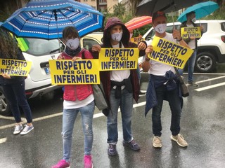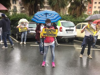 Maglietta bianca, cuffia e mascherina, cartelli e distanziamento sociale, si sono presentati così gli infermieri della provincia di Savona davanti al Palazzo del Governo, senza esporre bandiere o striscioni che richiamano sigle sindacali, così da poter dare la possibilità a tutti i colleghi che condividono le rivendicazioni.