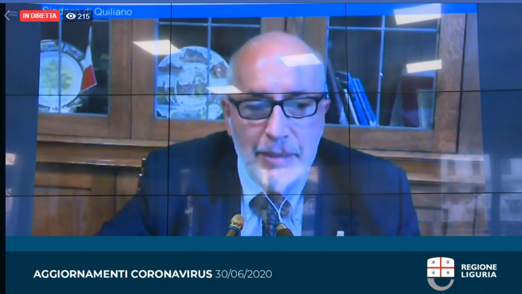 Nicola Isetta, sindaco di Quiliano, ospite in videoconferenza nella Sala Trasparenza della Regione Liguria, nell'ambito delle consuete dirette per parlare di ripartenza.