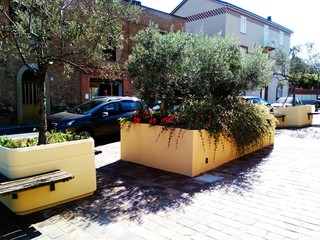 È interessante sottolineare anche quale utilizzo alternativo è stato concepito per la caldaia a gasolio dismessa: adeguatamente bonificata e riqualificata, è stata trasformata in una cisterna per la raccolta delle acque meteoriche (cioè piovane) che vengono veicolate ad uso irriguo e sanitario (cioè gli scarichi dei WC). Una parte della cisterna è stata invece abbellita ed è diventata un’aiuola di fronte alle scuole. Lo spazio verde è abbellito da un ulivo secolare fornito dai Vivai Montina.