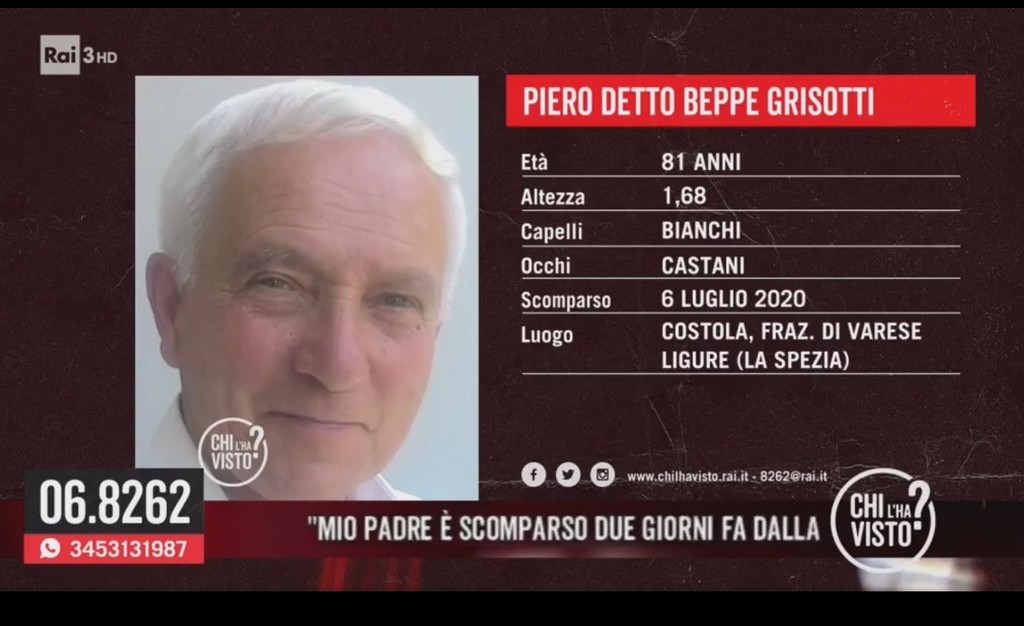 Si tratta di Piero Grisotti, pensionato e poeta per passione. Si è allontanato lunedì 6 luglio dalla casa di Varese Ligure. Soffre di disturbi di memoria. Il caso segnalato anche da "Chi l'ha visto". Il figlio pensa che il padre cerchi di tornare a casa a Saluzzo, suo riferimento mentale