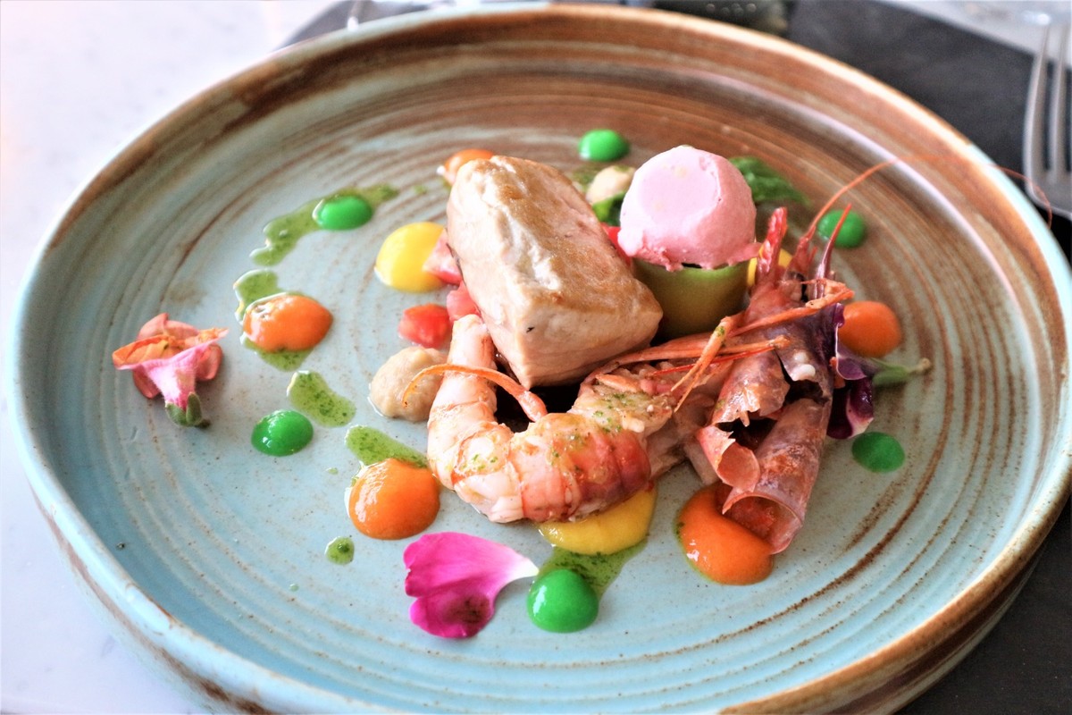 Bocconcino di Ricciola e Gambero d'Oneglia nell'orto con gelato al cuor di bue e basilico.
