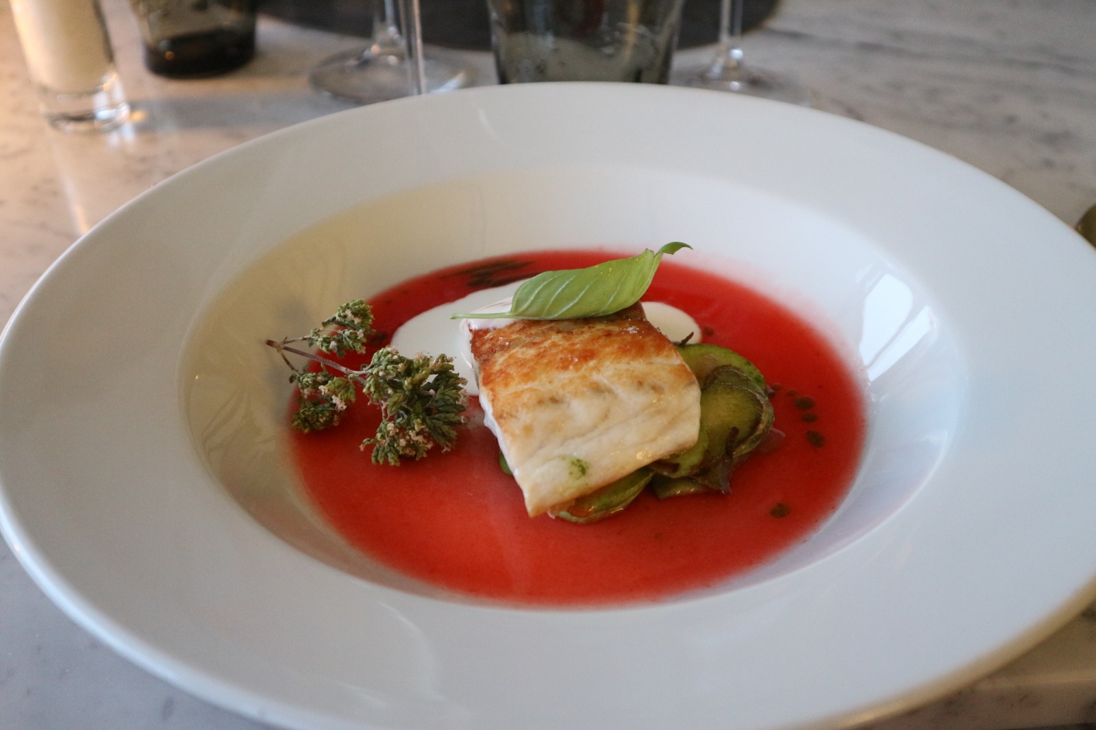 Filetto di Branzino di Capo Mele in acqua di cuor di bue con Trombette e stracchino liquido.