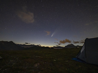 La cometa Neowise è stata immortalata mentre solcava il cielo delle Alpi Cozie, tra il Pelvo d’Elva e il Monviso. A fotografarla sono stati i soci del Gruppo Astrofili Savonesi, che ormai da 40 anni nel periodo estivo si recano, con tende e strumenti, in prossimità del Colle di Sampeyre, a 2300 m di quota, ove il cielo è più buio e trasparente.