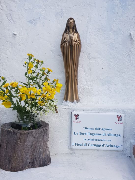 Infatti nei giorni scorsi “qualcuno” ha fatto a pezzi la statua della Madonnina e devastato il tempietto che la ospitava. I Fieui di caruggi, i sempreverdi monelli dei vicoli ingauni, si sono immediatamente messi all’opera e, grazie alla generosità dell’Agenzia Onoranze Funebri Le Torri Ingaune, hanno ricollocato al proprio posto la Madonnina del Monte Bignone (questa volta in bronzo e non in ceramica) e rimesso a posto l’edicola sacra.